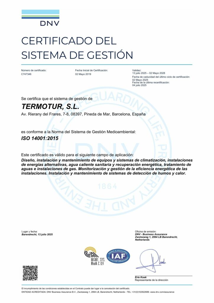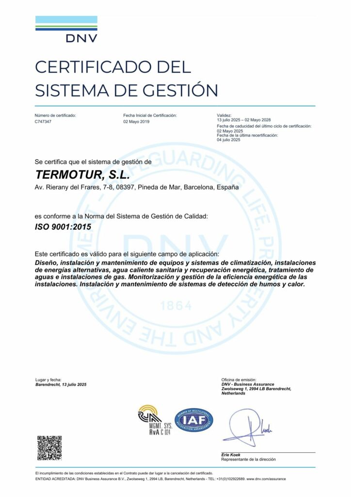 En Termotur diseñamos e instalamos sistemas de aerotermia para viviendas, espacios comerciales, hoteleros e instalaciones industriales, garantizando un correcto dimensionamiento y una integración óptima. Aunque la inversión inicial es más elevada, su alta rentabilidad se traduce en ahorro continuo en las facturas energéticas.